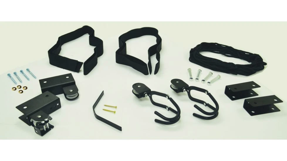 Overhead storage delivered in a insimple to installin package. The MPG346 Kayak Hammock features independent pulley control, self locking brake and steel construction that creates a dependable two point garage hoist system. The 120 lb load rating and oversized load straps easily store a cargo box, canoe, kayak or bicycle. Comes with a Lifetime Limited Warranty.![]()